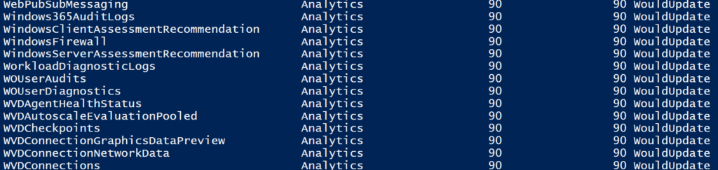 Write-Host "Retention Setting WhatIf Changes (in-scope tables)"